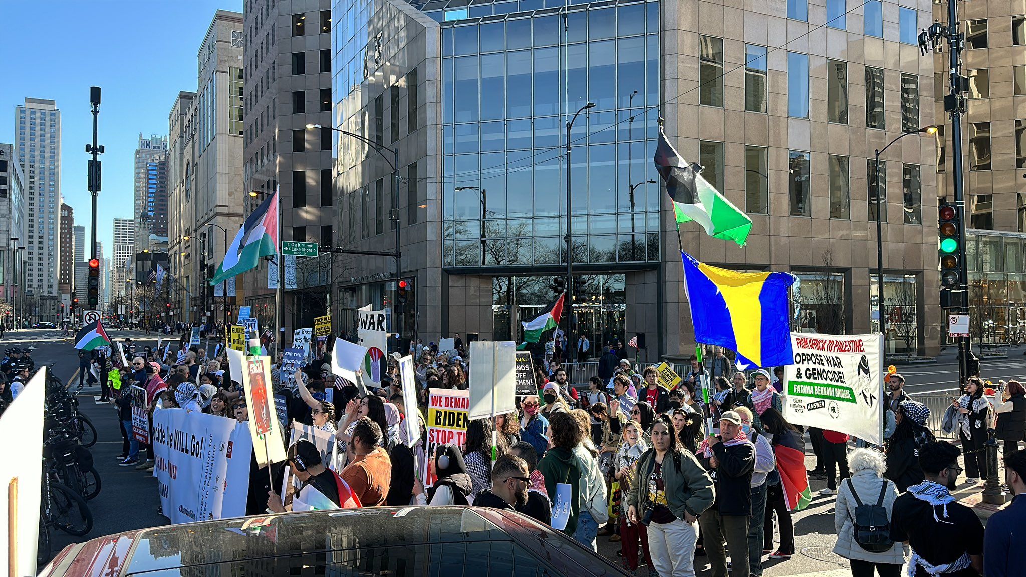 شيكاغو 9-4-2024 وفا– اعتصم المئات من النشطاء في مدينة شيكاغو الأميريكية أثناء حفل انتخابي في أحد فنادق المدينة لجمع التبرعات لصالح حملة الرئيس الأميركي جو بايدن، الذي كان حاضرا فيه لدعم حملة ترشحه للانتخابات الرئاسية المقبلة، وذلك لزيادة الضغط عليه لوقف الدعم العسكري والمادي لدولة الاحتلال في حربها على غزة.