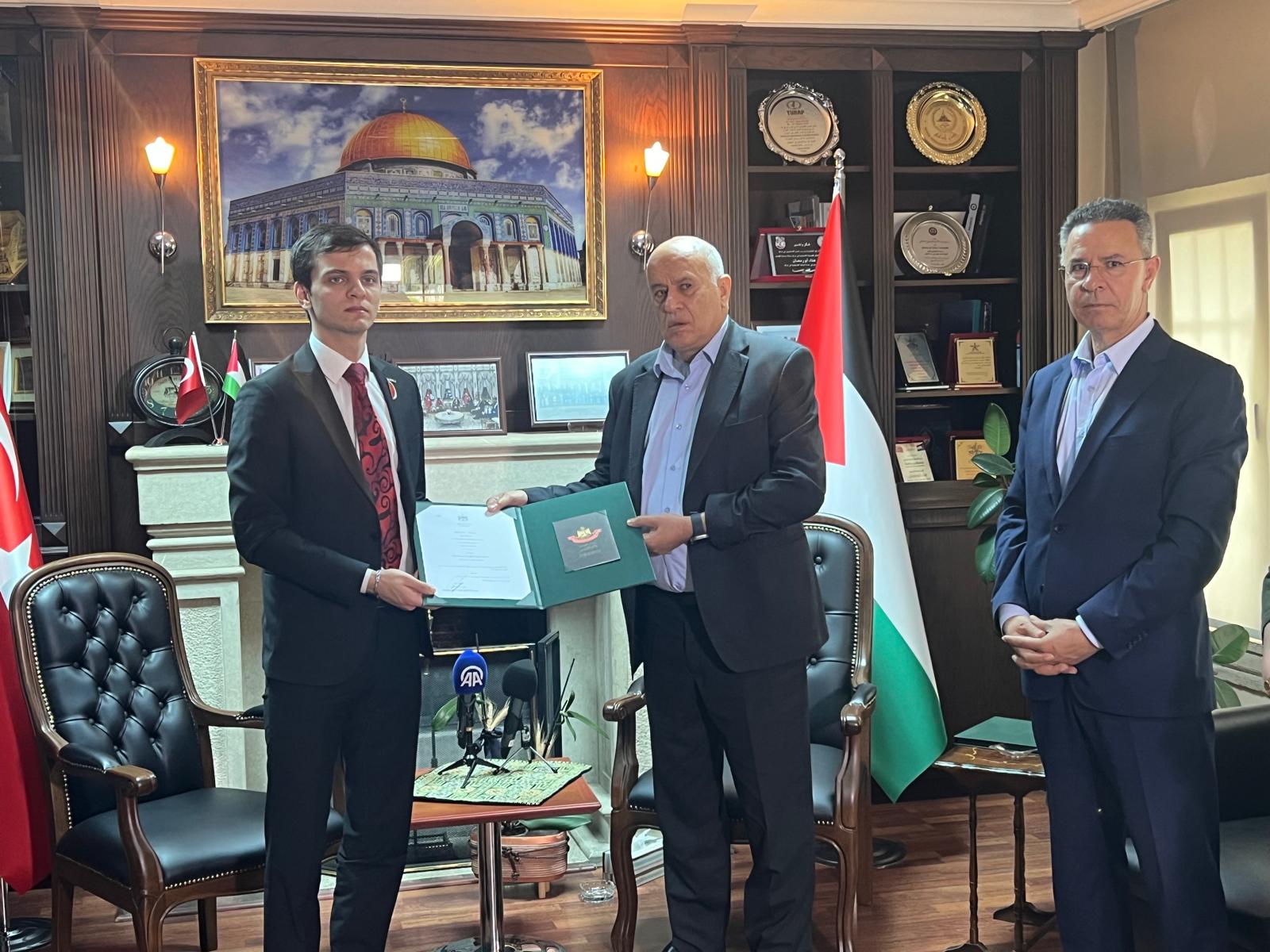 وسلم رئيس المجلس الأعلى للشباب والرياضة الفريق جبريل الرجوب، اليوم السبت، الوسام، للاعب أكيوز في قنصلية دولة فلسطين في إسطنبول، بحضور سفير دولة فلسطين لدى تركيا فائد مصطفى، والقنصل العام في أنقرة هناء أبو رمضان.