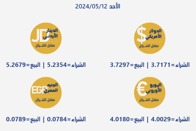 رام الله 12-5-2024 وفا- جاءت أسعار صرف العملات مقابل الشيقل الإسرائيلي، اليوم الأحد، بحسب سلطة النقد الفلسطينية، على النحو التالي: