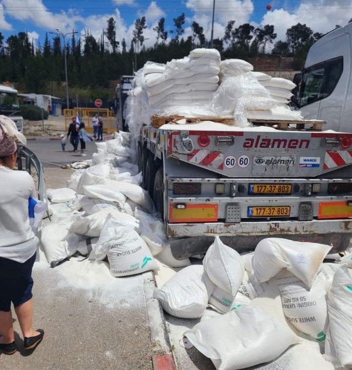 كما أظهرت المقاطع مستعمرين وهم يلقون حمولة إحدى الشاحنات على الأرض، لمنع دخولها إلى قطاع غزة، الذي تحاصره للعام الـ18.