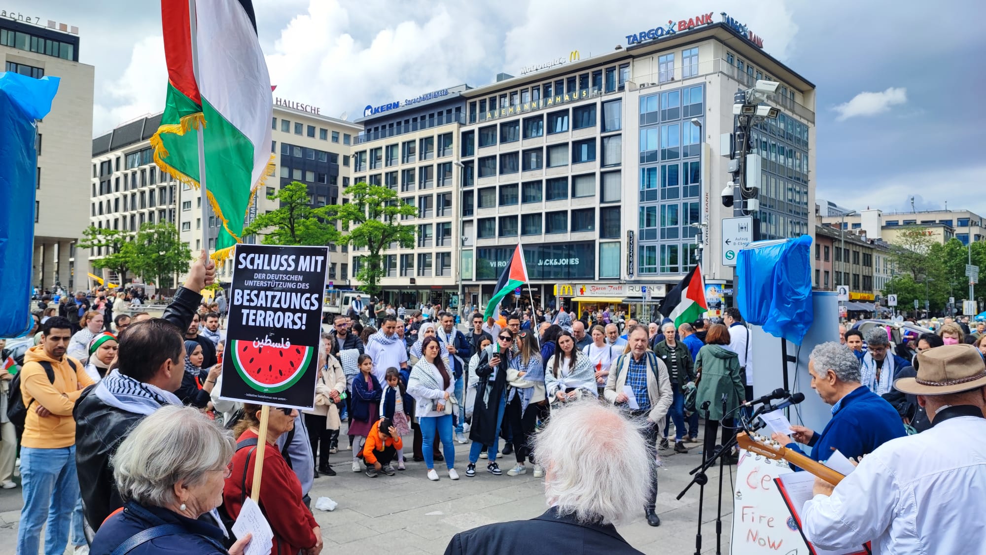 برلين 18-5-2024 وفا- أحيت الجالية الفلسطينية، والملتقى الفلسطيني الألماني في مقاطعة هسن الألمانية، الذكرى الـ76 للنكبة في مدينة فرانكفورت الألمانية، بالتعاون مع بعض مؤسسات المجتمع المدني الألماني مثل الصوت اليهودي من أجل السلام في الشرق الأوسط، وحزب اليسار الألماني، والمركز الاسلامي في مقاطعة هسن، وأطباء بلا حدود.