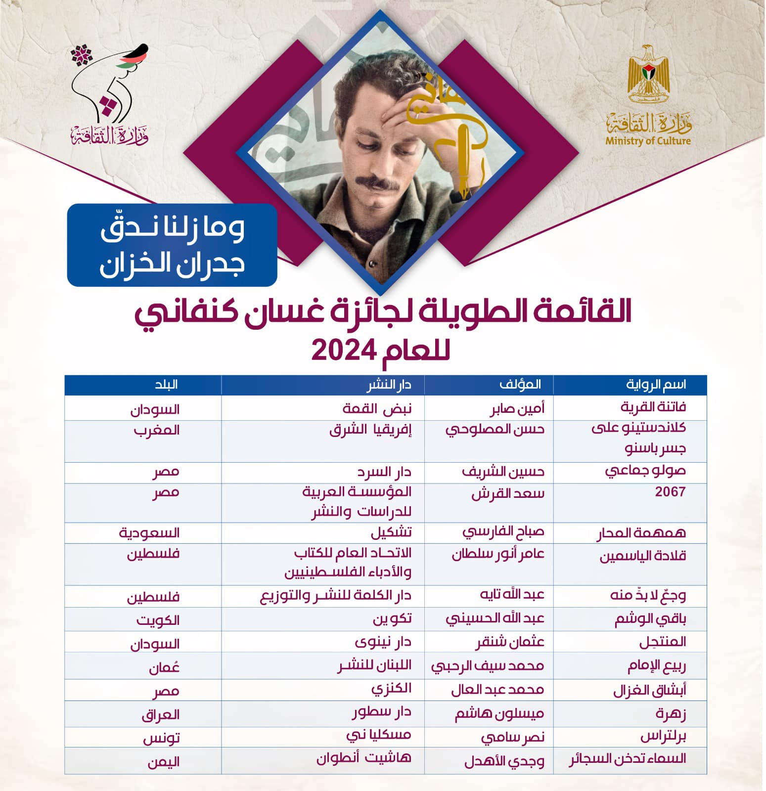 رام الله 19-5-2024 وفا- أعلنت جائزة غسّان كنفاني للرواية العربية التي تنظمها وزارة الثقافة، اليوم الأحد، الروايات المرشحة للقائمة الطويلة بدورتها الثالثة للعام 2024.