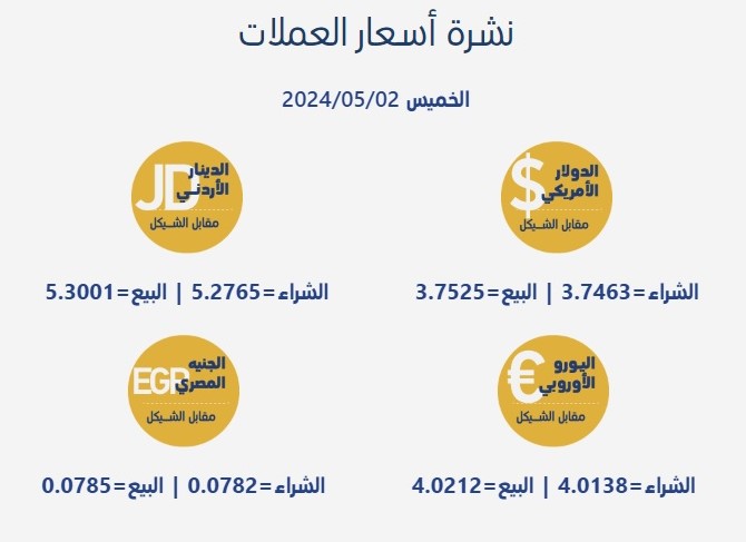 رام الله 2-5-2024 وفا- جاءت أسعار صرف العملات مقابل الشيقل الإسرائيلي، اليوم الخميس، بحسب سلطة النقد الفلسطينية، على النحو التالي: