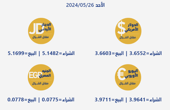 رام الله 26-5-2024 وفا- جاءت أسعار صرف العملات مقابل الشيقل الإسرائيلي، اليوم الأحد، بحسب سلطة النقد الفلسطينية، على النحو التالي: