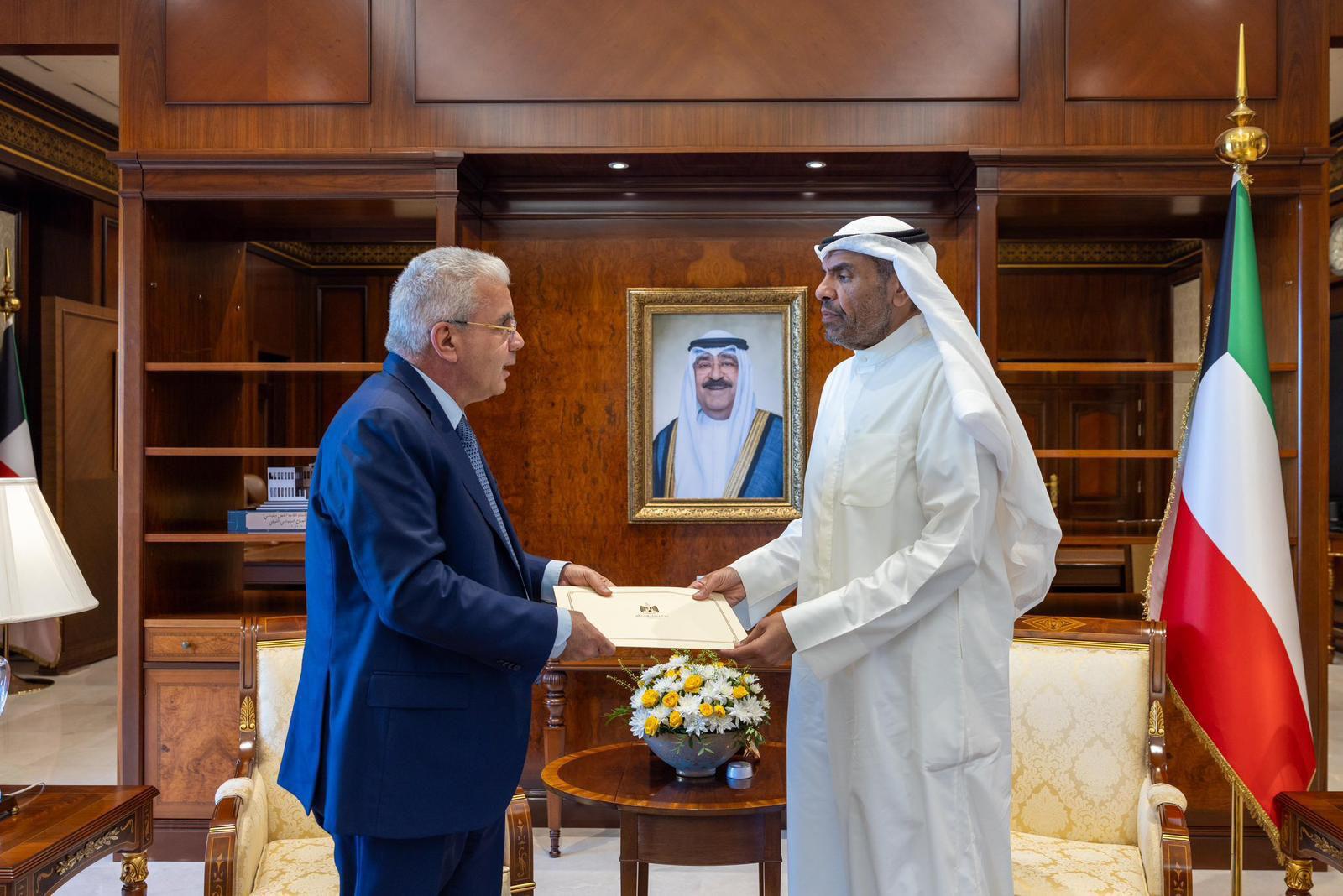 الكويت 27-5-2024 وفا- سلّم سفير دولة فلسطين لدى الكويت رامي طهبوب، اليوم الاثنين، رسالة خطية من الرئيس محمود عباس، رئيس دولة فلسطين، رئيس اللجنة التنفيذية لمنظمة التحرير الفلسطينية، إلى أخيه أمير دولة الكويت الشقيقة، الشيخ مشعل الأحمد الجابر الصباح.