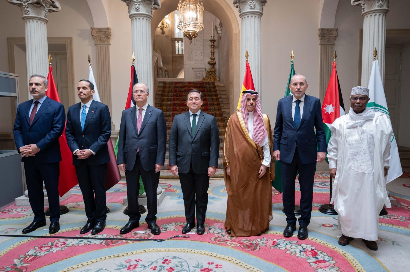 "استقبل رئيس وزراء مملكة إسبانيا بيدرو سانشيز اليوم الأربعاء في العاصمة مدريد، وفد اللجنة الوزارية المكلفة من القمة العربية الإسلامية الاستثنائية المشتركة بشأن التطورات في قطاع غزة، برئاسة وزير الخارجية السعودي فيصل بن فرحان بن عبدالله ، وحضور رئيس مجلس الوزراء وزير خارجية دولة قطر الشيخ محمد بن عبدالرحمن بن جاسم آل ثاني، ورئيس وزراء فلسطين وزير الخارجية محمد مصطفى، ونائب رئيس الوزراء وزير الخارجية وشؤون المغتربين في المملكة الأردنية الهاشمية أيمن الصفدي، ووزير خارجية الجمهورية التركية هاكان فيدان، والأمين العام لمنظمة التعاون الإسلامي حسين إبراهيم طه".
