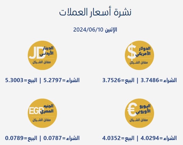 رام الله 10-6-2024 وفا- جاءت أسعار صرف العملات مقابل الشيقل الإسرائيلي، اليوم الإثنين، بحسب سلطة النقد الفلسطينية، على النحو التالي: