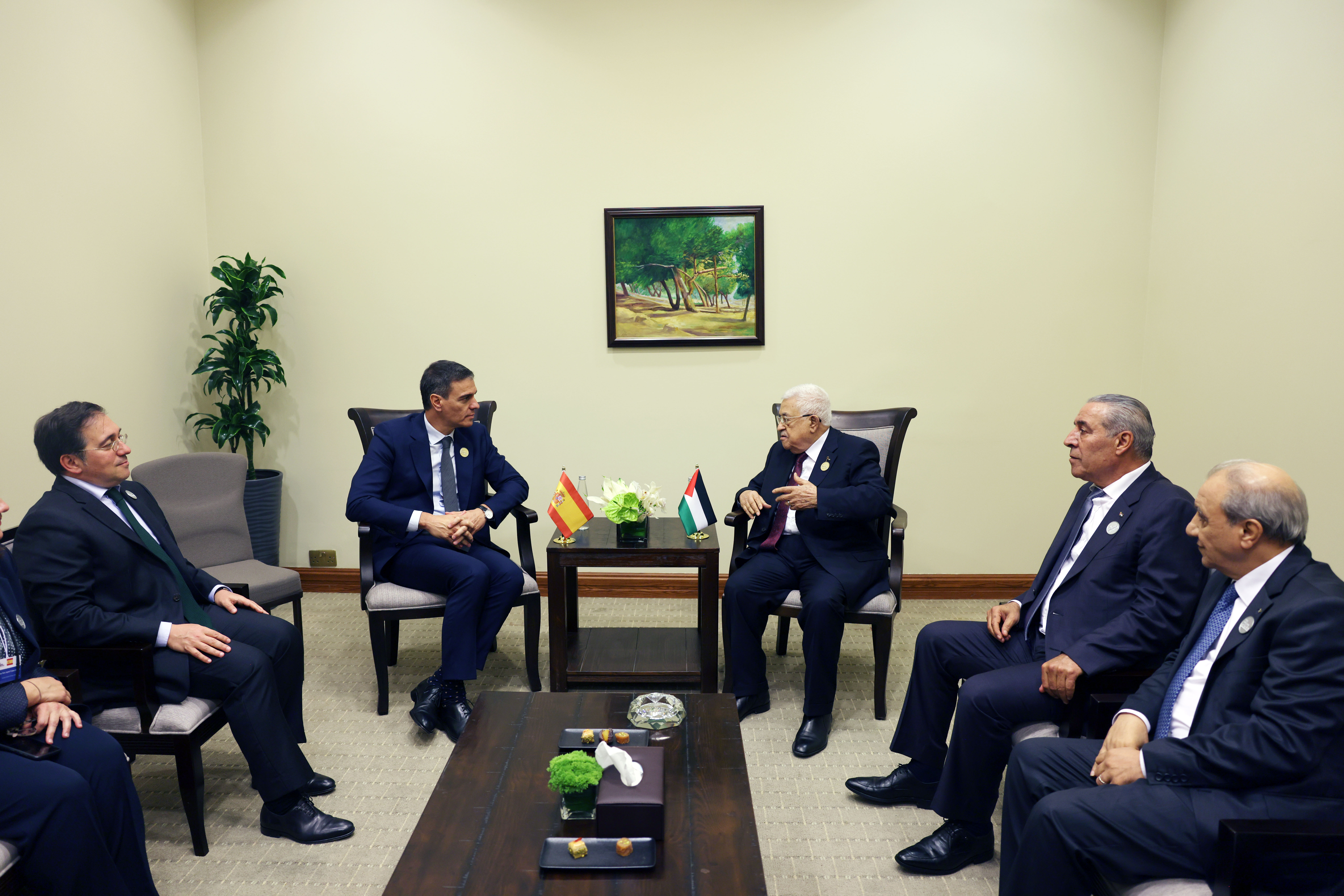 وشكر سيادته رئيس الوزراء الإسباني، على مواقف بلاده الشجاعة والمبدئية بالاعتراف بدولة فلسطين، والتي تأتي استكمالاً لمواقف مملكة إسبانيا الداعمة للقانون الدولي والشرعية الدولية، ودعم حق الشعب الفلسطيني في الحرية والاستقلال.