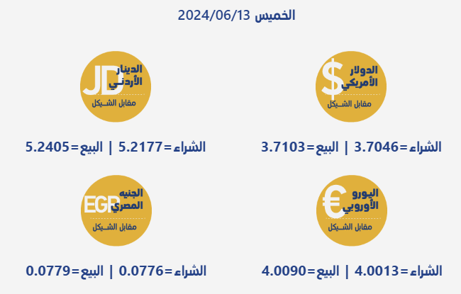 رام الله 13-6-2024 وفا- جاءت أسعار صرف العملات مقابل الشيقل الإسرائيلي، اليوم الخميس، بحسب سلطة النقد الفلسطينية، على النحو التالي: