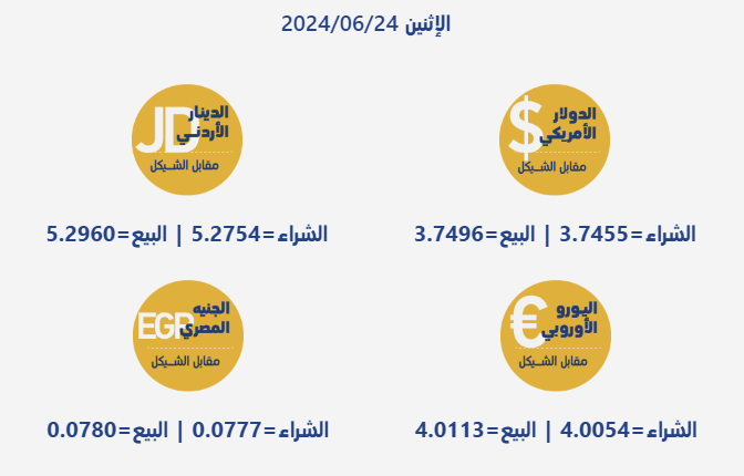 رام الله 24-6-2024 وفا- جاءت أسعار صرف العملات مقابل الشيقل الإسرائيلي، اليوم الإثنين، بحسب سلطة النقد الفلسطينية، على النحو التالي: