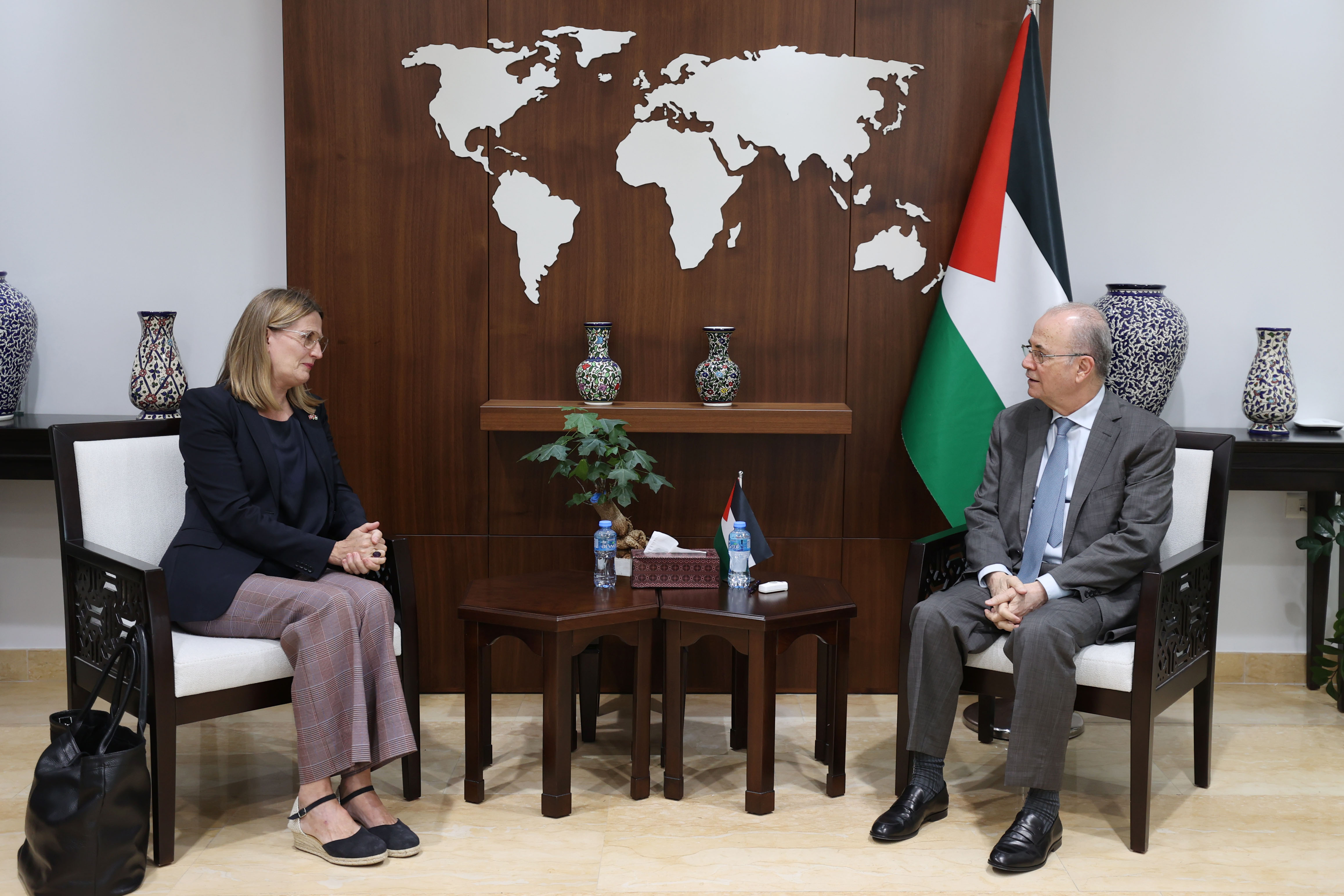 رام الله 24-6-2024 وفا- أطلع رئيس الوزراء وزير الخارجية محمد مصطفى، اليوم الاثنين، المبعوث السويسري للشرق الأوسط وشمال أفريقيا وولفغانغ أماديوس برولهارت، ومبعوثة النرويج لعملية السلام في الشرق الأوسط هيلدا هارالدستاد، كل على حدة، على آخر المستجدات في فلسطين على الصعد كافة.