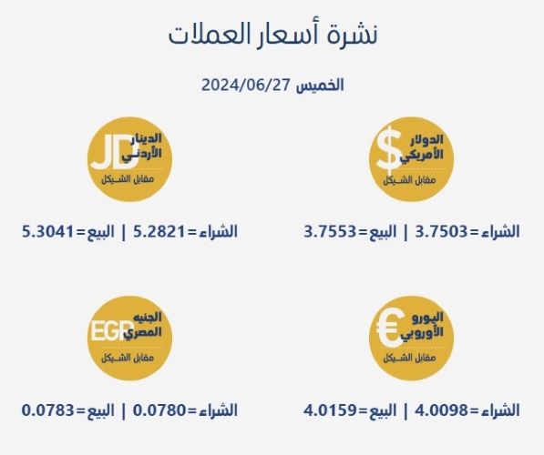 رام الله 27-6-2024 وفا- جاءت أسعار صرف العملات مقابل الشيقل الإسرائيلي، اليوم الخميس، بحسب سلطة النقد الفلسطينية، على النحو التالي: