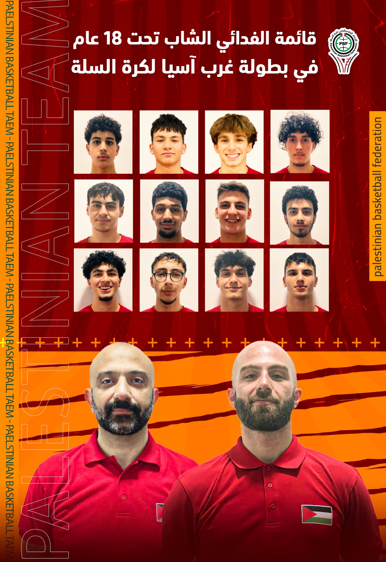 ويترأس الوفد الفلسطيني رئيس اتحاد كرة السلة إبراهيم حبش ويضم المدرب فراس سعيدة، ومساعده سعيد الناجي، و12 لاعبا هم: نصري شامية، إبراهيم علي، انجلوس مشمنت كريتسوتاكيس، محمد-ريان كيميتو، كمال شمشوم، إندراوس قمصية، أحمد طشطة، كرم البياع، عادل مسعد، باسل علم، رامز زايد، وعمر علي. كما يرافق الوفد كل من الحكم الدولي عنان دراغمة، والمسؤول اللوجستي سامر أبو غوش.