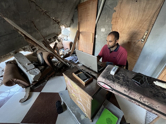 غزة 12-7-2024 وفا- متسلحا بالعلم وفي تحد للقصف الإسرائيلي المستمر لأكثر من 9 أشهر على قطاع غزة، تمكن الطالب أنس القانوع من مناقشة رسالة الدكتوراه من داخل منزله المدمر.
