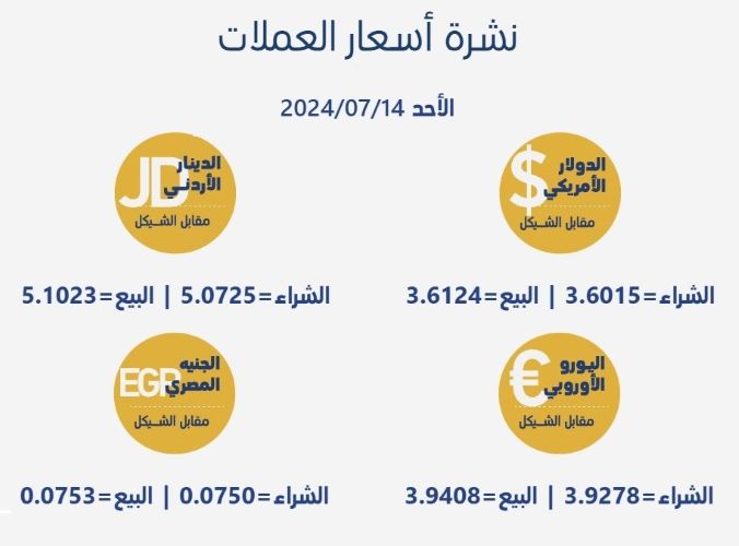 رام الله 14-7-2024 وفا- جاءت أسعار صرف العملات مقابل الشيقل الإسرائيلي، اليوم الاحد، بحسب سلطة النقد الفلسطينية، على النحو التالي: