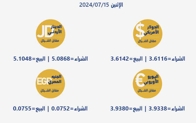رام الله 15-7-2024 وفا- جاءت أسعار صرف العملات مقابل الشيقل الإسرائيلي، اليوم الإثنين، بحسب سلطة النقد الفلسطينية، على النحو التالي: