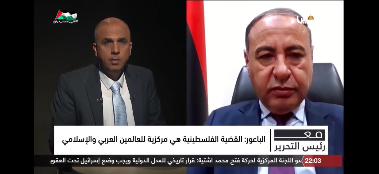 ولفت الباعور إلى أن الشعب الليبي بأكمله مرتبط ارتباطا وجدانيا بالقضية الفلسطينية، ويقف إلى جانب الشعب الفلسطيني منذ احتلال أرضه ومستمر في ذلك حتى نيلهم حقوقهم المشروعة، مؤكدا أن القضية الفلسطينية قضية مركزية وعلى العالم الإسلامي والعربي الوقوف إلى جانب الشعب الفلسطيني حتى نيل حريته واستقلاله.