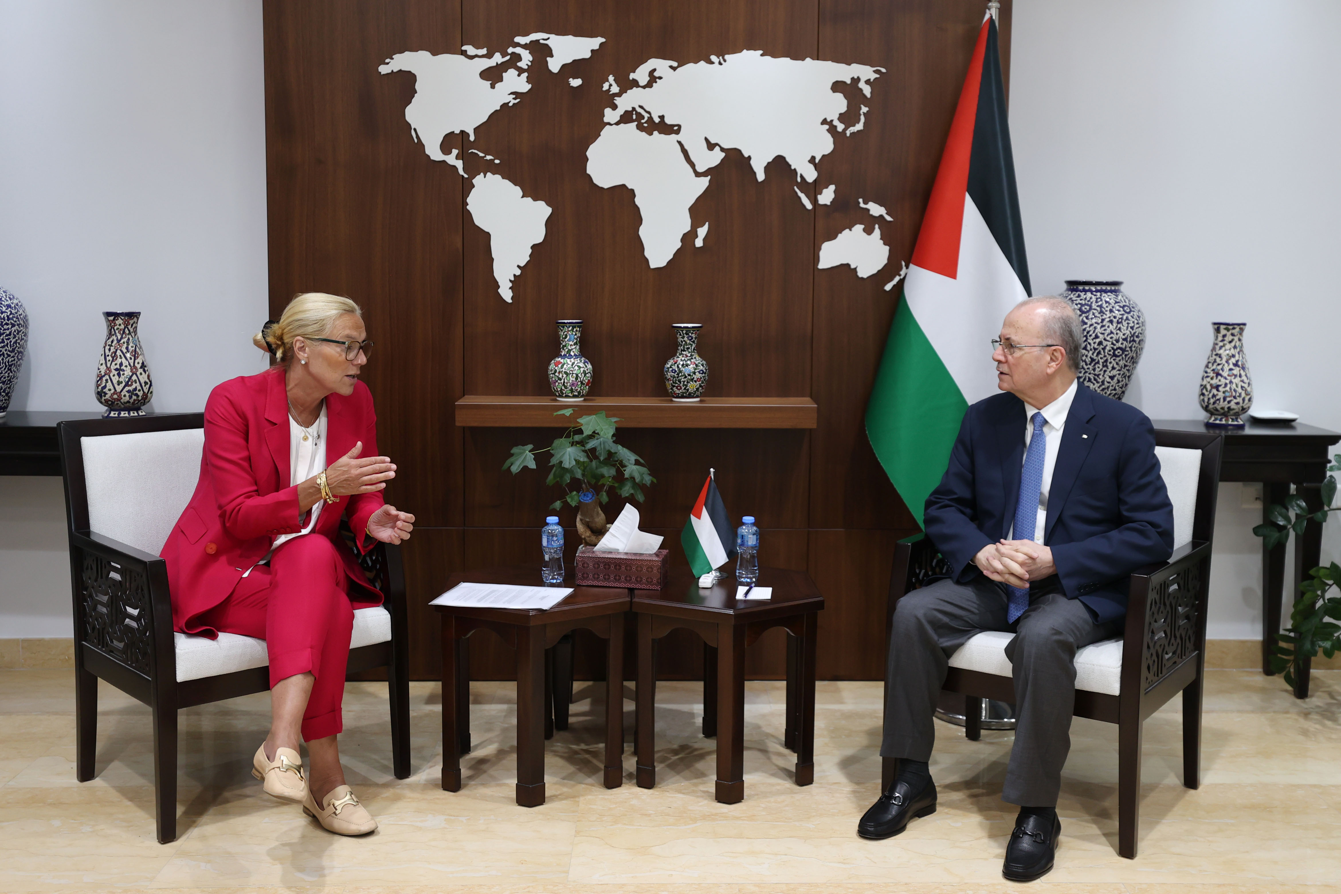 رام الله 21-7-2024 وفا- بحث رئيس الوزراء محمد مصطفى، خلال لقائه كبيرة منسقي الأمم المتحدة للشؤون الإنسانية وإعادة الإعمار في غزة سيغريد كاغ، اليوم الأحد في مكتبه برام الله، تعزيز الجهود الإغاثية والإنسانية في قطاع غزة، وزيادة إدخال المساعدات وضمان وصولها إلى جميع أنحاء القطاع، بحضور وزيرة التنمية الاجتماعية سماح حمد.