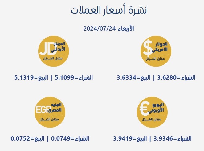 رام الله 24-7-2024 وفا- جاءت أسعار صرف العملات مقابل الشيقل الإسرائيلي، اليوم الأربعاء، بحسب سلطة النقد الفلسطينية، على النحو التالي: