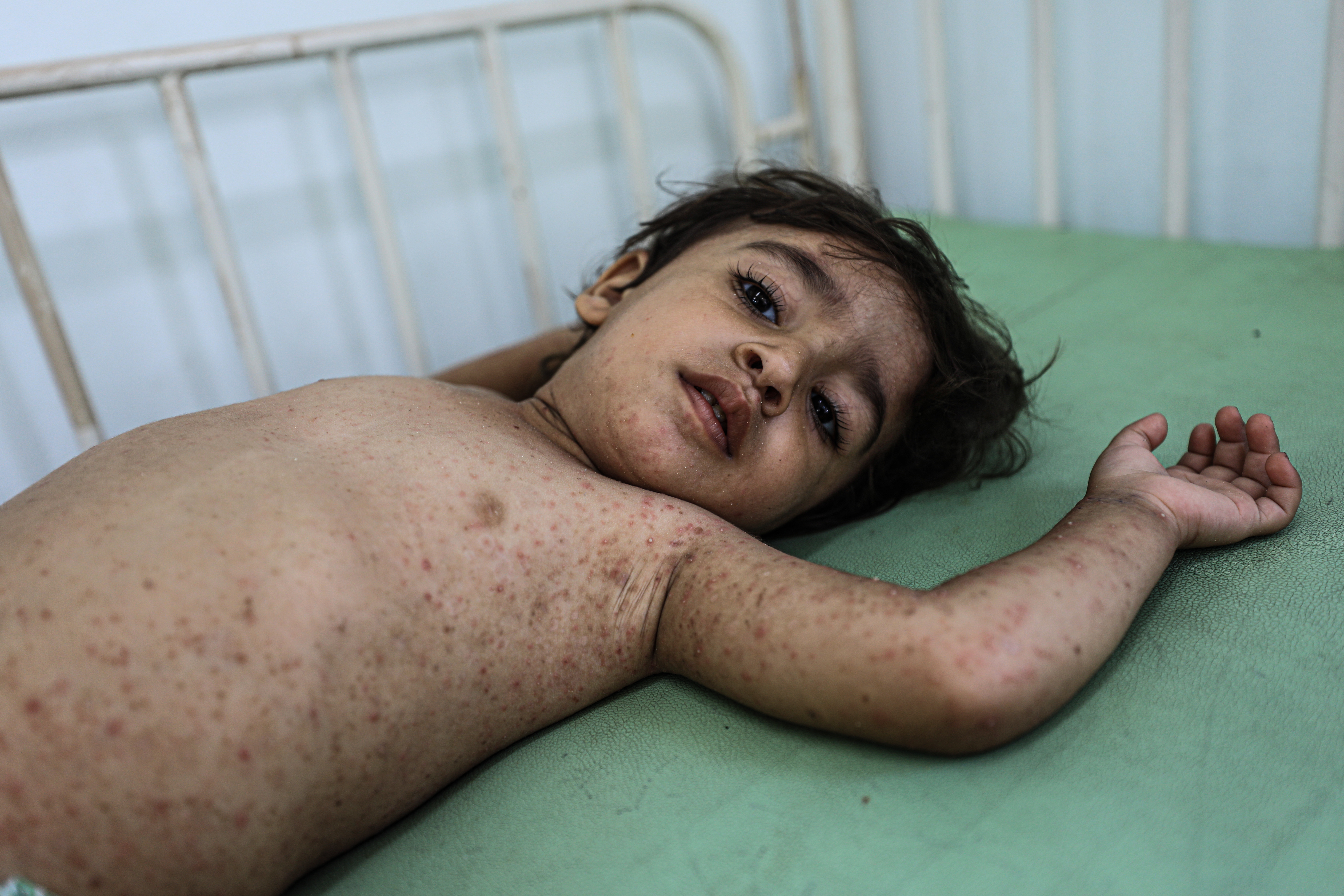 وداخل المستشفى، تنظر الأم رنا أبو كرنوب إلى طفلتيها بحزن شديد جراء انتشار حبوب كبيرة في جسدهن، صنفها الأطباء بأنها "جدري مائي".