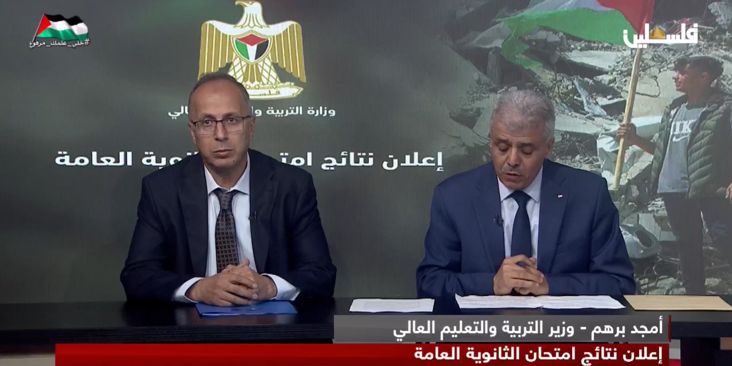 وقال وزير التربية والعليم العالي أمجد برهم إن الاحتلال حال دون تقدّم 39 ألف طالب ثانوية عامة من ممارسة حقهم في التعليم، بعد أن صادر حقّ عشرة آلاف من طلبة المدارس والجامعات في القطاع في الحياة، منهم 450 من طلبة الثانوية، علاوة على استشهاد 400 معلم، و105 من علمائنا من كوادر الجامعات، في ظل وجود 55 معتقلا من طلبة الثانوية العامة، وترافق ذلك مع تدمير286 مبنى من أصل 307 بناء مدرسي، و31 من المباني التابعة لجامعاتنا في غزة بشكل كامل.