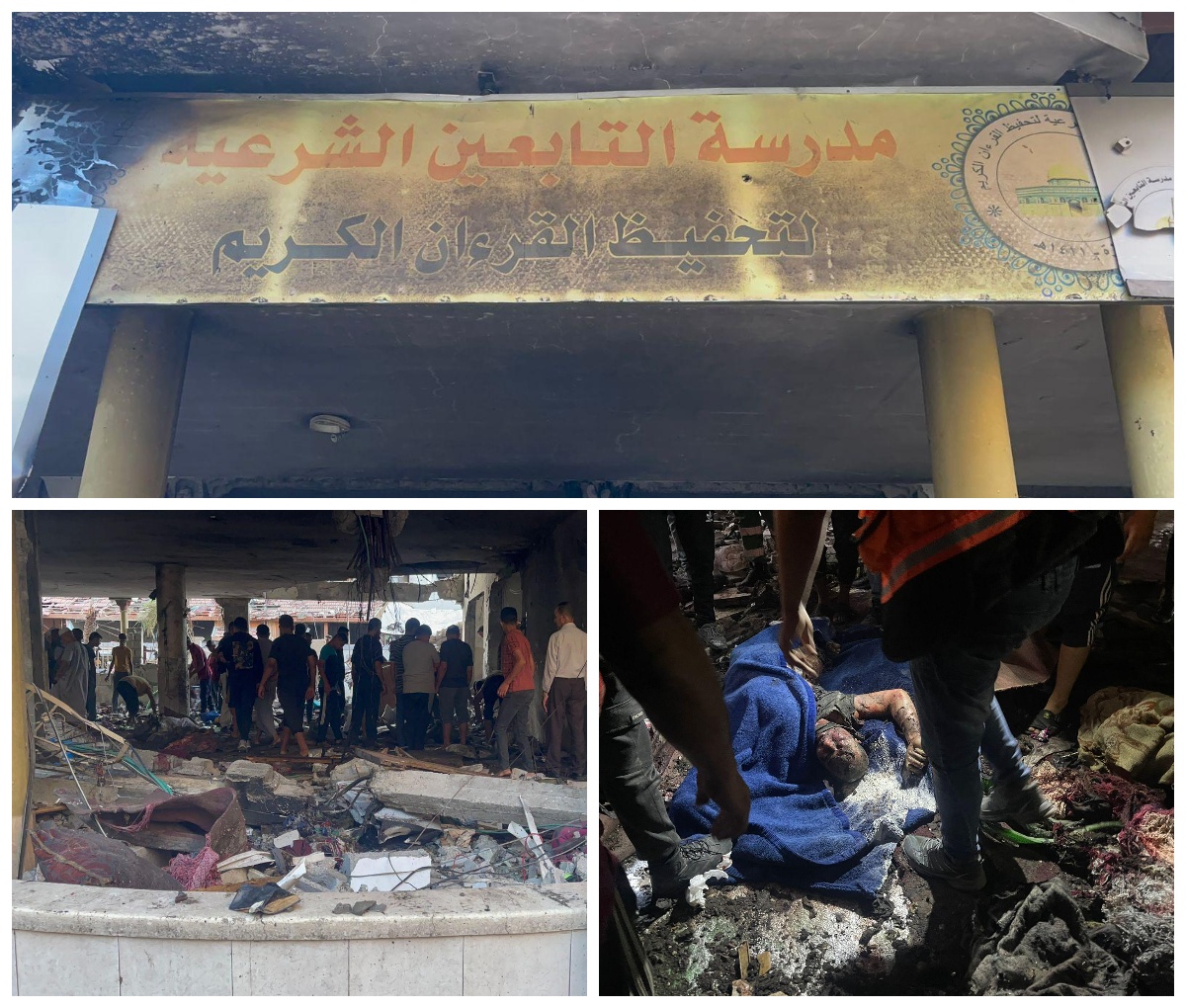وأفادت مصادر محلية، بأن طيران الاحتلال الحربي قصف مدرسة "التابعين" التي تؤوي نازحين في منطقة الصحابة بحي الدرج شرق مدينة غزة، بثلاثة صواريخ بشكل مباشر، وذلك خلال أداء المواطنين صلاة الفجر في المصلى.