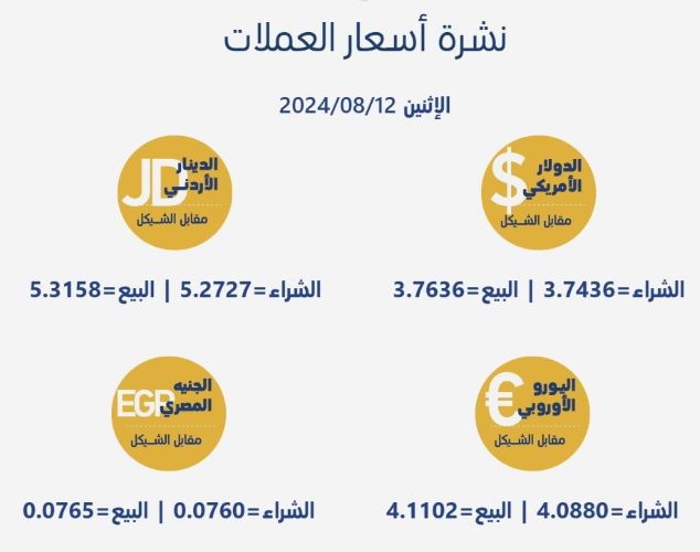 رام الله 12-8-2024 وفا- جاءت أسعار صرف العملات مقابل الشيقل، اليوم الإثنين، بحسب سلطة النقد الفلسطينية، على النحو التالي: