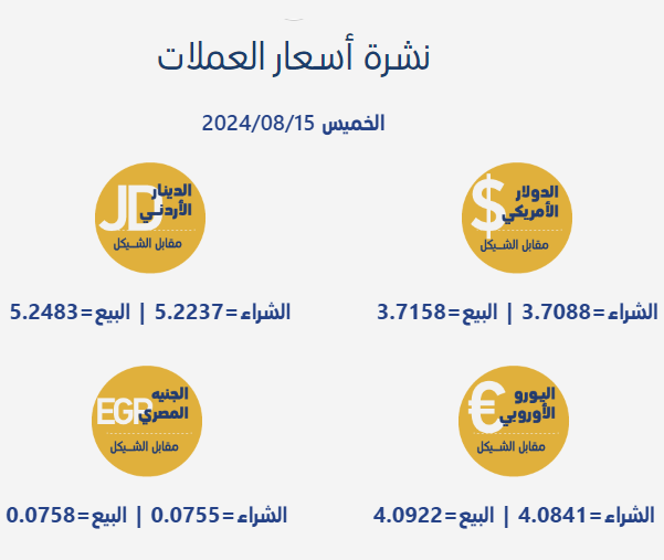 رام الله 15-8-2024 وفا- جاءت أسعار صرف العملات مقابل الشيقل، اليوم الخميس، بحسب سلطة النقد الفلسطينية، على النحو التالي: