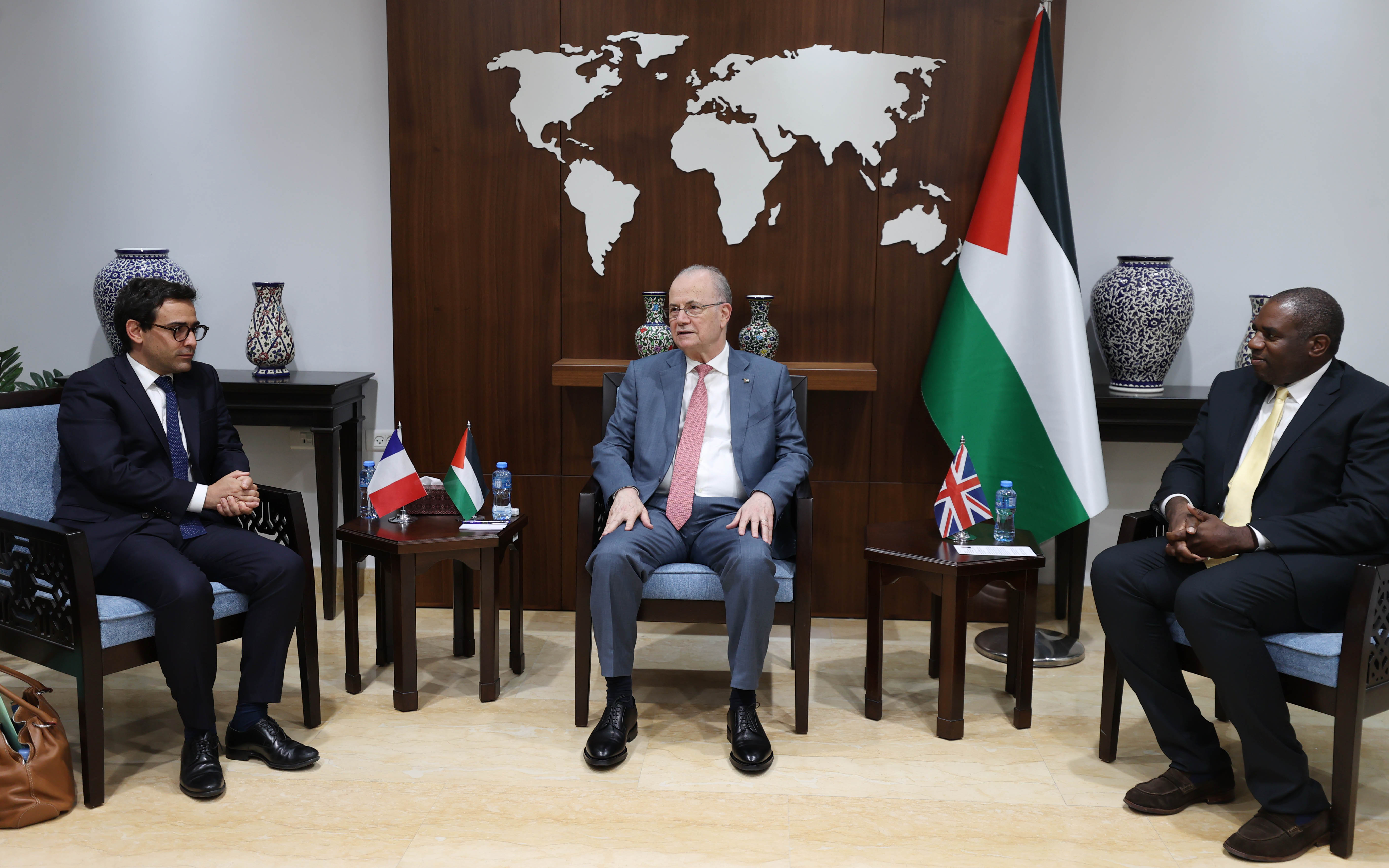 رام الله 16-8-2024 وفا- بحث رئيس الوزراء، وزير الخارجية والمغتربين محمد مصطفى، اليوم الجمعة، مع وزيري الخارجية البريطاني ديفيد لامي، والفرنسي ستيفان سيجورنيه، دفع الجهود من أجل وقف حرب الإبادة على شعبنا في قطاع غزة وتعزيز الجهود الاغاثية في قطاع غزة، ووقف تصعيد جيش الاحتلال والمستعمرين واعتداءاتهم في الضفة الغربية.