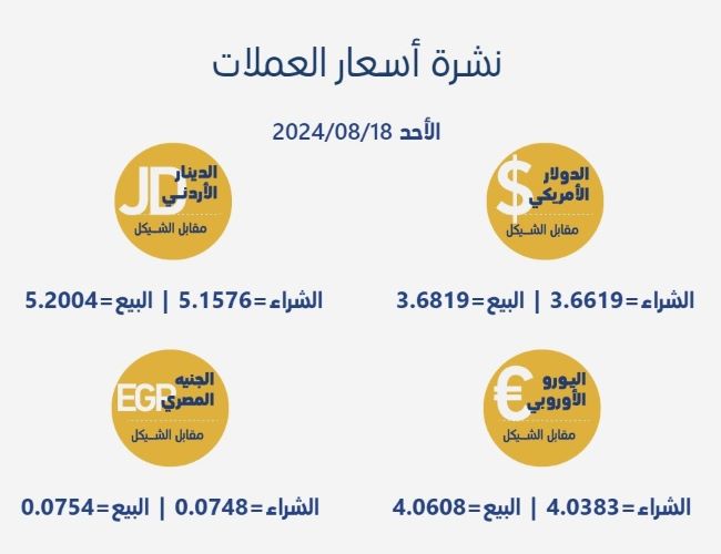 رام الله 18-8-2024 وفا- جاءت أسعار صرف العملات مقابل الشيقل، اليوم الأحد، بحسب سلطة النقد الفلسطينية، على النحو التالي: