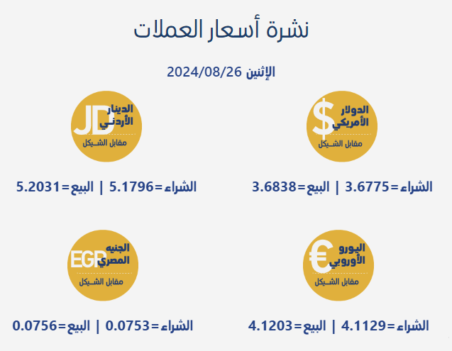 رام الله 26-8-2024 وفا- جاءت أسعار صرف العملات مقابل الشيقل الإسرائيلي، اليوم الإثنين، بحسب سلطة النقد الفلسطينية، على النحو التالي: