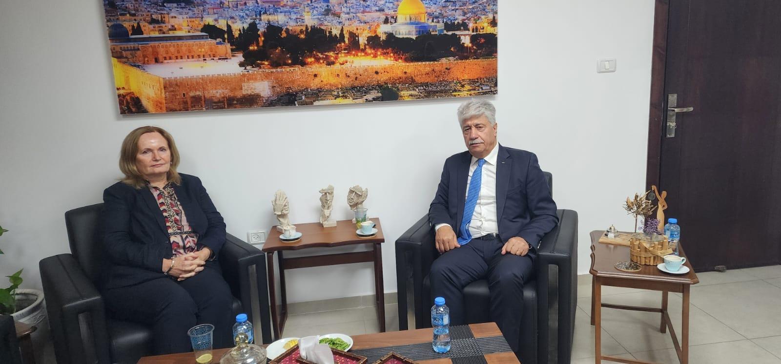 رام الله 27-8-2024 وفا- التقى عضو اللجنة التنفيذية لمنظمة التحرير الفلسطينية أحمد مجدلاني، بالقنصل البريطاني العام دايان كورنر، في مكتبه بمدينة رام الله، اليوم الثلاثاء، إذ ناقش آخر المستجدات السياسية على الساحة الفلسطينية والإقليمية والدولية، وسبل وقف العدوان، كما تمت إعادة التأكيد على الرفض القاطع للإجراءات والسياسات الإسرائيلية التصعيدية الخطيرة في الضفة الغربية.