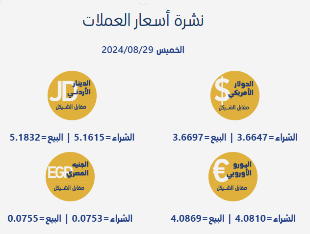 رام الله 29-8-2024 وفا- جاءت أسعار صرف العملات مقابل الشيقل، اليوم الخميس، بحسب سلطة النقد الفلسطينية، على النحو التالي: