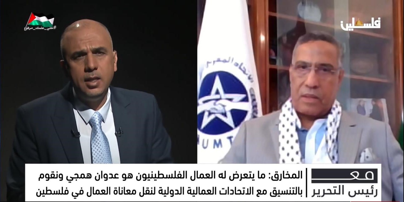 وأكد أن الاتحاد يبذل كل الجهود على الصعد كافة، أحدها العمل مع نقابة النقل العمالية العالمية لمنع إفراغ أو تحميل بضائع الاحتلال في الموانئ الدولية لمحاصرة حكومة الاحتلال، مطالبا الطبقة العاملة العربية والدولية بمساندة العمال في فلسطين ونصرة القضية الفلسطينية.