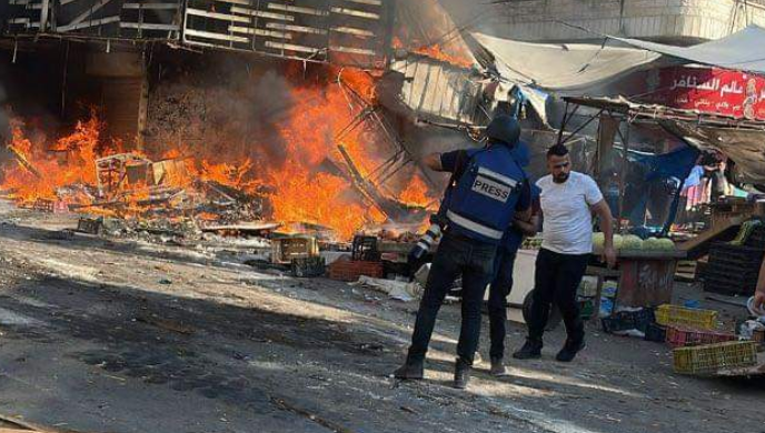 وقال شهود عيان، إن النيران اشتعلت في عدد من البسطات وأجزاء من المحلات في حسبة الخضار، بفعل تعمد قوات الاحتلال على اشعالها، فيما تحاول طواقم الدفاع المدني السيطرة على الحريق، واخمادها.