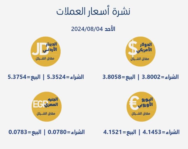 رام الله 4-8-2024 وفا- جاءت أسعار صرف العملات مقابل الشيقل، اليوم الأحد، بحسب سلطة النقد الفلسطينية، على النحو التالي: