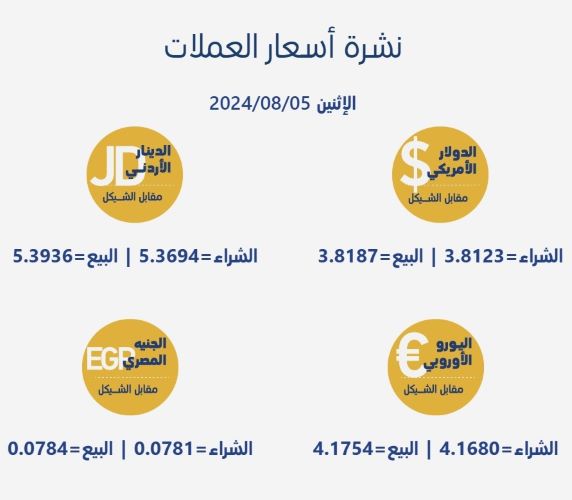 رام الله 5-8-2024 وفا- جاءت أسعار صرف العملات مقابل الشيقل، اليوم الإثنين، بحسب سلطة النقد الفلسطينية، على النحو التالي: