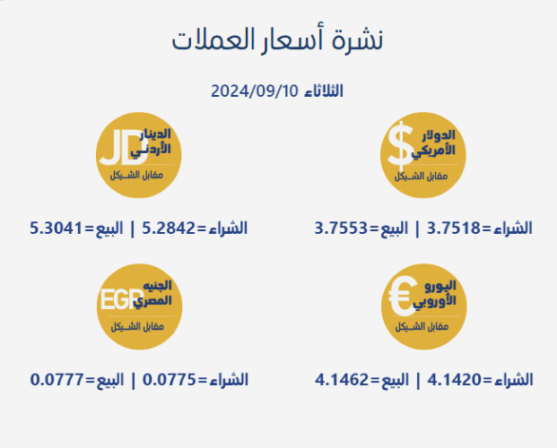 رام الله 10-9-2024 وفا- جاءت أسعار صرف العملات مقابل الشيقل، اليوم الثلاثاء، بحسب سلطة النقد الفلسطينية، على النحو التالي: