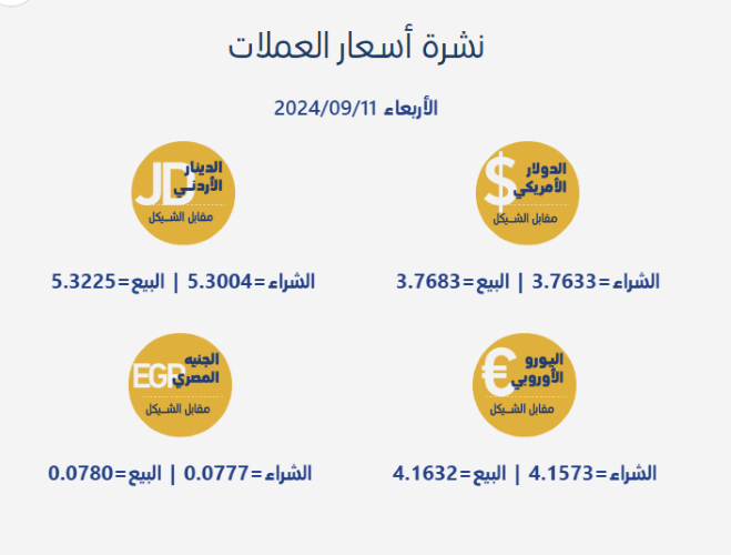 رام الله 11-9-2024 وفا- جاءت أسعار صرف العملات مقابل الشيقل، اليوم الأربعاء، بحسب سلطة النقد الفلسطينية، على النحو التالي: