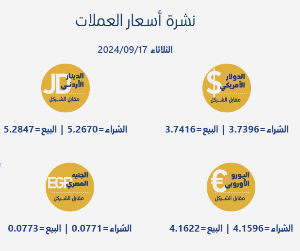 رام الله 17-9-2024 وفا- جاءت أسعار صرف العملات مقابل الشيقل، اليوم الثلاثاء، بحسب سلطة النقد الفلسطينية، على النحو التالي: