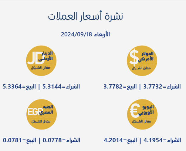 رام الله 18-9-2024 وفا- جاءت أسعار صرف العملات مقابل الشيقل، اليوم الأربعاء، بحسب سلطة النقد الفلسطينية، على النحو التالي: