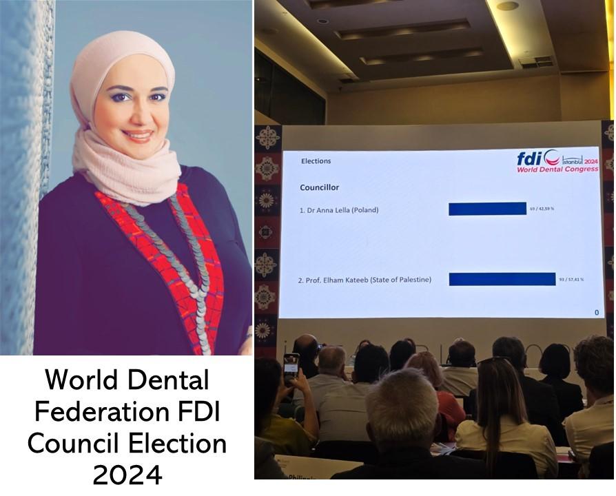 القدس 18-9-2024 وفا- فازت الدكتورة الهام الخطيب عميد البحث العلمي في جامعة القدس واستاذ مشارك في كلية طب الاسنان، في انتخابات الفيدرالية العالمية لطب الاسنان بمقعد في الهيئة الاستشارية المكونة من عشر اعضاء على مستوى العالم.