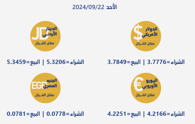 رام الله 22-9-2024 وفا- جاءت أسعار صرف العملات مقابل الشيقل، اليوم الأحد، بحسب سلطة النقد الفلسطينية، على النحو التالي: