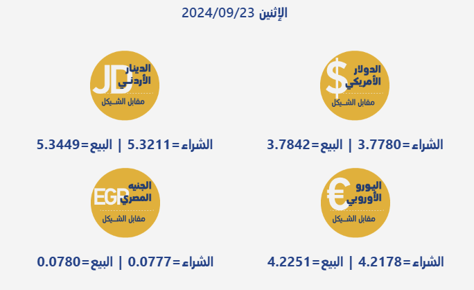 رام الله 23-9-2024 وفا- جاءت أسعار صرف العملات مقابل الشيقل، اليوم الإثنين، بحسب سلطة النقد الفلسطينية، على النحو التالي: