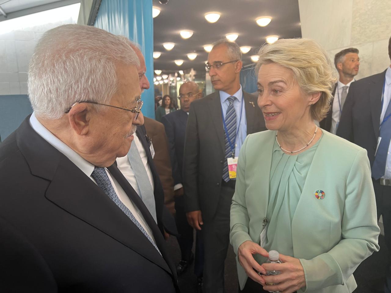 نيويورك 25-9-2024 وفا- التقى رئيس دولة فلسطين محمود عباس، اليوم الأربعاء، رئيسة المفوضية الأوروبية أورسولا فون دير لاين، على هامش مشـاركته في اجتماعات الدورة الـ 79 للجمـعية العامة للأمم المتحدة، في نيويورك.