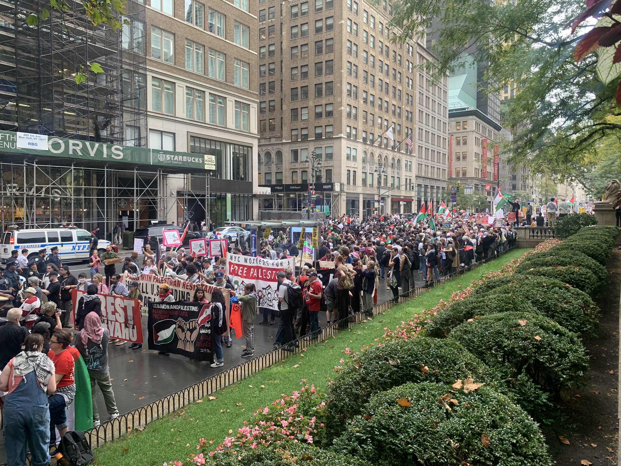 ومنذ اللحظة الأولى لوصول نتنياهو لحي منهاتن، للمشاركة في اجتماعات الجمعية العامة، انطلقت المسيرات الجماهيرية في عدة شوارع، لإعلاء صوتهم احتجاجاً على الجرائم التي يرتكبها نتنياهو وجيشه بحق الشعب الفلسطيني منذ قرابة العام، وما يحدث من عدوان آخر على الشعب اللبناني منذ أيام.