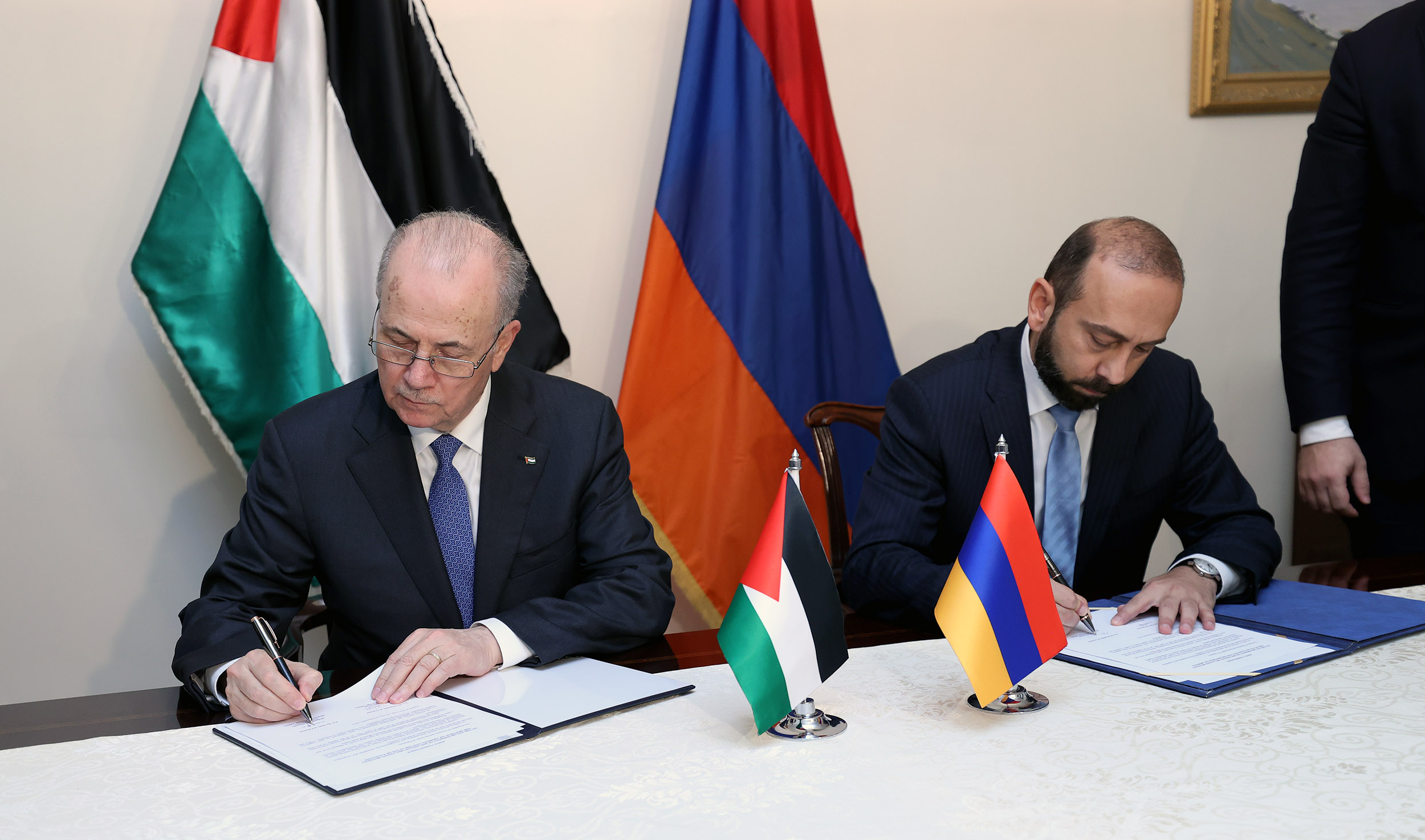 نيويورك 28-9-2024 وفا- وقع رئيس الوزراء وزير الخارجية محمد مصطفى، مع وزير خارجية أرمينيا أرارات ميرزويان، إعلانا مشتركا بشأن إقامة علاقات دبلوماسية ما بين دولة فلسطين وجمهورية أرمينيا.