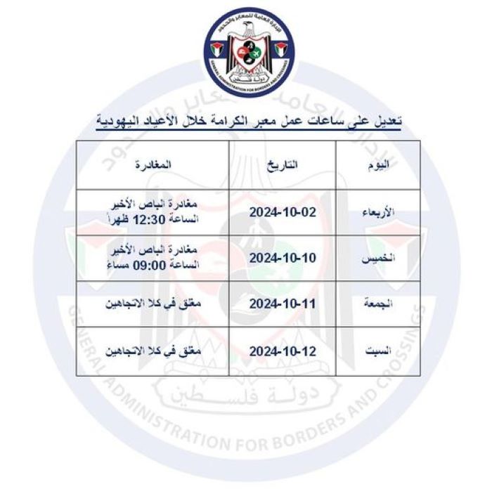 أريحا 30-9-2024 وفا- أعلنت الإدارة العامة للمعابر والحدود، إجراء تعديل على ساعات عمل معبر الكرامة، خلال شهر تشرين الأول المقبل، وذلك بسبب الأعياد اليهودية.