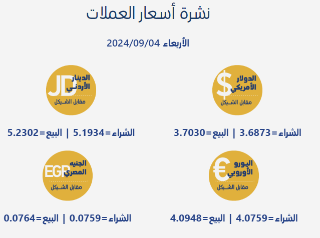 رام الله 4-9-2024 وفا- جاءت أسعار صرف العملات مقابل الشيقل، اليوم الأربعاء، بحسب سلطة النقد الفلسطينية، على النحو التالي:
