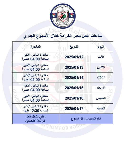 أريحا 12-1-2025 وفا- أعلنت الإدارة العامة للمعابر والحدود، اليوم الأحد، ساعات عمل معبر الكرامة (جسر الملك حسين) خلال الأسبوع الجاري.